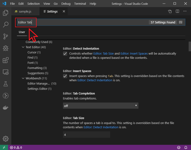 설정(Settings) 창에서 탭 간격 설정하기